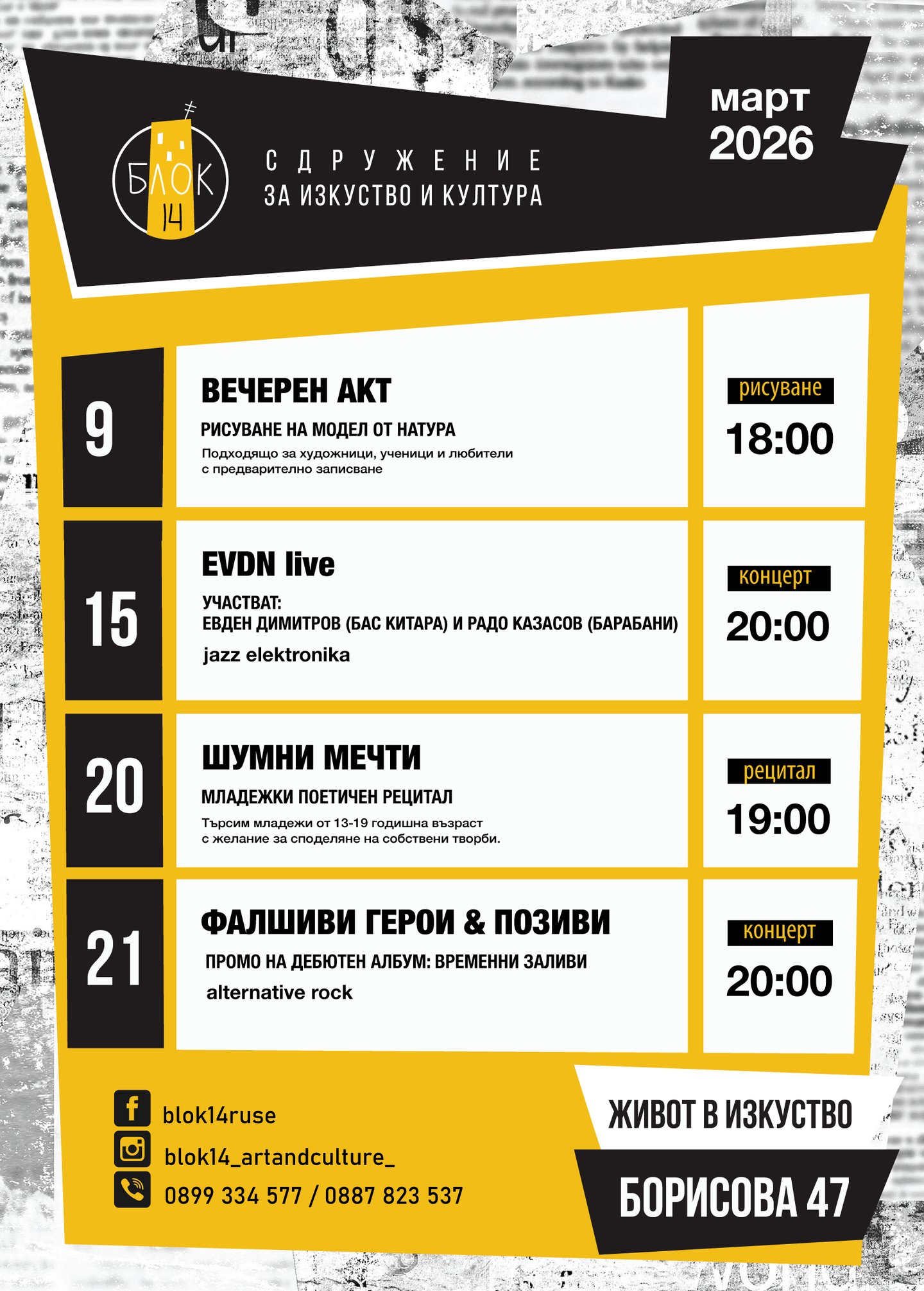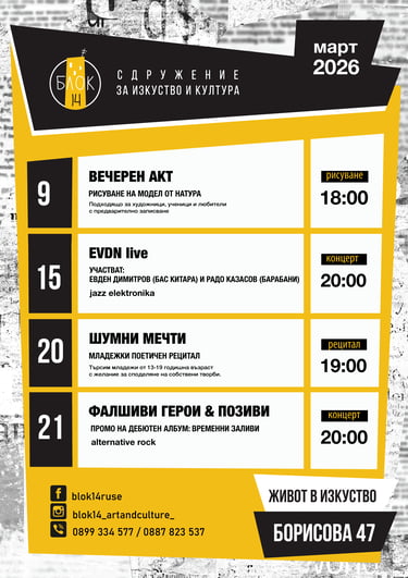 Този сайт е създаден по проекта "Живот в изкуство" на Сдружение "Блок 14", финансиран по Програмата за възстановяване и развитие на частни културни организации на НФК, 2022